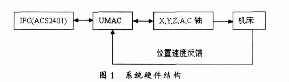 本系統 UMAC控制器主要分為以下幾個模塊: 工作電源、 CPU 卡、 軸卡 1、 軸卡 2、 I/O 卡組成。該系統中軸卡采用的是 ACC-24E2S軸卡, 它可最多控制 4 軸, 由于本系統要五根軸, 因此采用 2 塊軸卡來控制機床的 5 個電機軸, ACC- 24E2S是脈沖加方向控制量接口板。I/O卡采用的是 ACC- 11E, 光電隔離 24 輸入/24 輸出接口板;