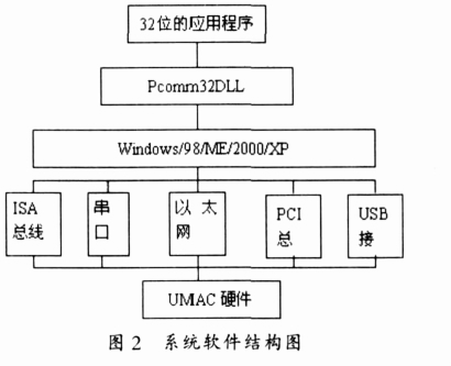 對于工控機與 UMAC組成的開放式數控系統, 其軟件結構由上位界面和下位控制程序組成, 兩者依靠通信相互聯系, 共同完成系統功能, 其中通信程序的開發可以借助 Delta Tau 公司提供的 Pcomm32 的 32 位應用程序通信驅動器(它囊括了同 UMAC通信的所有方式)。該公司提供的應用通信程序將主要通信函數進行分類、 封裝, 形成動態鏈接庫, 該動態鏈接庫可以由用戶直接調用。 PLC程序也可以借助該公司提供的接口方便地進行開發。本文主要對基于工控機的數控機床用戶應用程序進行開發, 這也是控制系統的關鍵所在。整個系統軟件結構其軟件結構如圖 2 所示。