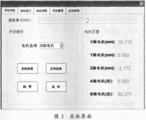 其具體界面入圖 3, 能對系統進行手動操作, 自動加工電機參數設置, 系統管理和在線幫助。在自動加工過成中, 能夠看到運動程序和加工過程中的刀具的具體路徑。