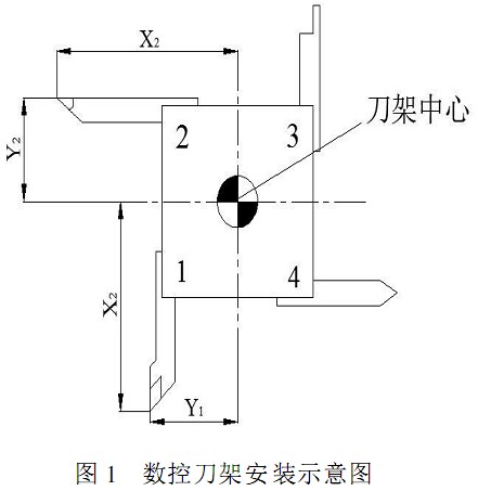 刀具位置尺寸補(bǔ)償?shù)膶?shí)質(zhì)是將刀具相對于工件的坐標(biāo)由刀具安裝的定位點(diǎn)移到刀尖位置。以最簡單的四工位數(shù)控車床旋轉(zhuǎn)刀架為例,由圖1可以看出,刀具1 相對與刀架中心的坐標(biāo)為 X1 、Y1 ,刀具2相對于刀架中心的位置為X2 、Y2 ,因?yàn)閿?shù)控車床刀具安裝系統(tǒng)的特性,即便是尺寸完全相同的兩把刀具安裝在同一臺(tái)數(shù)控機(jī)床的旋轉(zhuǎn)刀架上,其相對于刀架中心的尺寸也不可能完全相同,所以需要通過對刀操作以補(bǔ)償因?yàn)椴煌毒呦鄬τ诘都艹叽绮煌趽Q刀時(shí)出現(xiàn)的刀尖不重合的現(xiàn)象,簡言之,就是要通過車刀位置尺寸補(bǔ)償來使不同尺寸的車刀在同一個(gè)工件坐標(biāo)系的坐標(biāo)中運(yùn)動(dòng)。數(shù)控車床對刀設(shè)置的方法一般有試切對刀、機(jī)械對刀儀對刀( 接觸式)、光學(xué)對刀儀對刀( 非接觸式) 等。