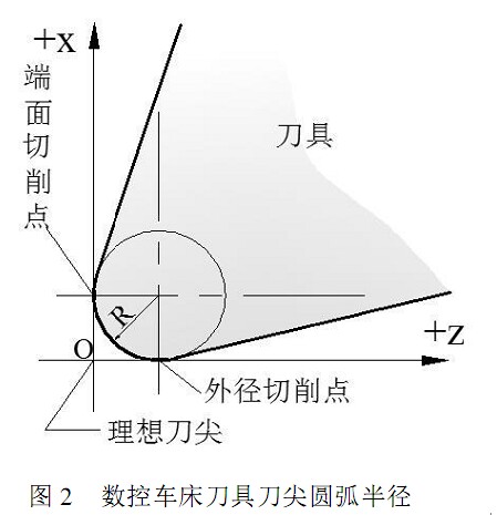 通過上面的刀具位置尺寸補(bǔ)償,我們已將數(shù)控編程的坐標(biāo)點(diǎn)設(shè)置在了刀具刀尖點(diǎn)上。但為了提高刀具的使用壽命和降低加工工件的表面粗糙度,通常將刀尖磨成半徑不大的圓弧,一般圓弧半徑尺寸在0 . 4 ~ 1. 6 mm 之間,如圖 2 所示。很顯然,假想刀尖點(diǎn)與實(shí)際切削點(diǎn)是不同點(diǎn),當(dāng)加工與坐標(biāo)軸平行的圓柱面和端面輪廓時(shí),刀尖圓弧并不影響其尺寸和形狀。但當(dāng)加工錐面、圓弧等非坐標(biāo)方向輪廓時(shí),刀尖圓弧將引起其尺寸和形狀誤差,而且刀尖圓弧半徑越大,誤差越大。這種誤差的大小不僅與輪廓形狀、走勢有關(guān)。而且與刀尖圓弧半徑有關(guān),當(dāng)零件加工精度要求較高時(shí),就可能出現(xiàn)超差,所以如果在數(shù)控加工或數(shù)控編程時(shí)不對刀尖圓角半徑進(jìn)行補(bǔ)償,僅按照工件輪廓編制的程序來加工,勢必會(huì)產(chǎn)生加工誤差[ 1]。