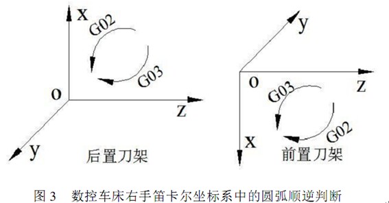 實(shí)踐證明,在實(shí)際生產(chǎn)過程中,可以不考慮右手笛卡爾坐標(biāo)系,直接看零件圖就判斷出圓弧加工的左右補(bǔ)償,即在圓弧編程時(shí),始終只分析零件圖軸線上半部分圓弧形狀,當(dāng)沿該段圓弧形狀從起點(diǎn)畫向終點(diǎn)為順時(shí)針方向時(shí)就用GO2 ,反之就用 GO3。原因很簡單,車床指向刀架的為X 軸的正方向,指向尾座為Z 的正方向,那么前后刀架的X 軸的方向是相反的,就導(dǎo)致參與判斷的第三軸 Y 軸的正方向是相反的,一個(gè)指向紙外,一個(gè)指向紙內(nèi),如圖3 所示。在后置刀架的數(shù)控車床加工中,由于 Y 軸指向紙外,在 XOZ 坐標(biāo)系中我們直接選擇工件的零件圖軸線上半部分圓弧形狀判斷圓弧順逆,而前置刀架的數(shù)控車床Y 軸指向紙內(nèi),我們選擇工件的零件圖軸線下半部分圓弧形狀判斷圓弧順逆時(shí)應(yīng)該從紙內(nèi)向紙外觀察,其結(jié)果正好與