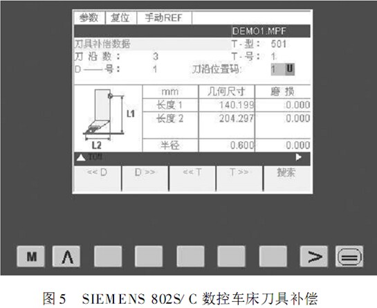 在SIEMENS 數(shù)控系統(tǒng)中,使用 Txx 調(diào)用刀具,其刀具補(bǔ)償號(hào)由 Dx x 指令指定,其后的數(shù)字表示刀具偏置存儲(chǔ)器號(hào)。例如 T01 D01 ,如圖5所示,對應(yīng)刀具位置補(bǔ)償中,長度 1 就是X 軸方向的補(bǔ)償,長度2 就是Z 軸方向的補(bǔ)償,刀具圓弧半徑補(bǔ)償值 R 填在半徑存儲(chǔ)器里。與 FANUC系統(tǒng)相同,其中一般將對刀結(jié)果存儲(chǔ)在長度對應(yīng)的幾何尺寸中,而長度對應(yīng)的損存儲(chǔ)器一般用于輸入切削余量和修正對刀結(jié)果以及由于刀具磨損形成的零件加工誤差。在自動(dòng)執(zhí)行過程中,數(shù)控系統(tǒng)調(diào)用該存儲(chǔ)器中的長度1 、長度2 、半徑的幾何尺寸和磨損值疊加的數(shù)值,自動(dòng)修正刀具的位置誤差和自動(dòng)進(jìn)行刀尖圓弧半徑補(bǔ)償[ 3 ]。