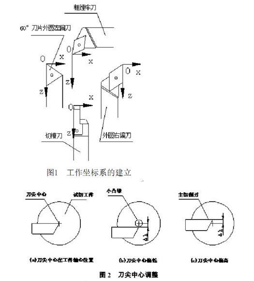 在工件坐標(biāo)系建立之前, 還要考慮到車刀安裝后刀尖中心是否處于軸心位置的, 因此, 單把車刀的對刀包括:刀尖中心的高度調(diào)整和工件坐標(biāo)系的建立兩個過程.