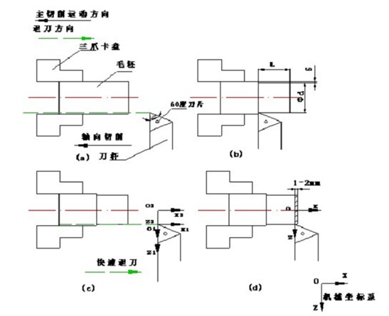值, 即所量出的 Φd 無須除 2. (7)將車刀的刀尖中心, 置于工件右端面內(nèi)軸向距離1~2mm處, 重新切換至OFFSET界面, 將該把車刀的 G54 坐標(biāo)系 z=0 設(shè)置于該位置. 至此建立出圖 3-d 所示的工件坐標(biāo)系 oxz.