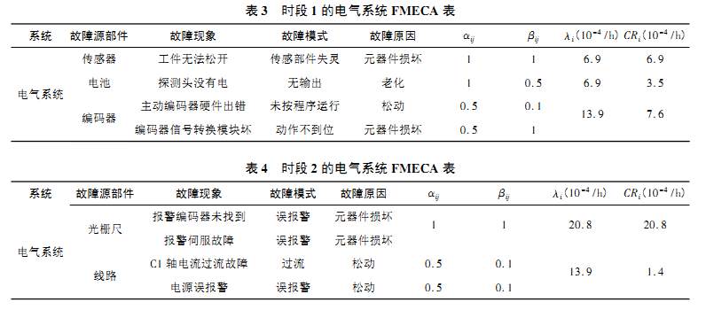通過(guò)FMECA分析表能夠直觀地分析出哪種故障對(duì) 生產(chǎn)的危害度最大。由表3得出,時(shí)段1時(shí)的編碼器危害 度大于其他2項(xiàng),是加工中心在時(shí)段1時(shí)最應(yīng)該加以防護(hù) 的危害。在時(shí)段2時(shí),光柵尺危害度達(dá)到了 20. 8,是整個(gè) 系統(tǒng)中危害度最大的一項(xiàng),而且都是因?yàn)楣鈻懦邠p壞造成 的,在日常維修工作中還需改善光柵尺選型及定期清理等 相關(guān)工作。從時(shí)段1和時(shí)段2的FMECA分析表中得出,2 個(gè)故障器的電氣系統(tǒng)常見(jiàn)故障危害度并不相同,這是因?yàn)?加工中心在不同的時(shí)間段里會(huì)表現(xiàn)出不同的故障,所以, 對(duì)加工中心不同故障時(shí)期的研究是有著重要的現(xiàn)實(shí)意義 及實(shí)用價(jià)值的。
