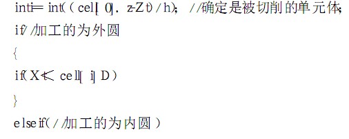 讀入經過程序處理模塊得到的仿真驅動信息,即刀具運動信息,得到車刀刀尖處的位置( X t ,Z t) ,根據Z t確定刀具經過的小圓柱單元在工件數組中的位置,也就是確定哪個單元體被切削. 然后比較該單元體的直徑和刀尖點的X t坐標,確定該單元體是否被切削.具體的實現命令如: