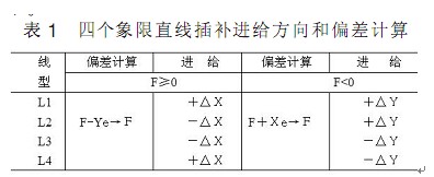 與前面進(jìn)行比較后發(fā)現(xiàn) 當(dāng)被插補(bǔ)直線處于不同象限時(shí) 其計(jì)算公式及處理過(guò)程完全一樣 僅僅是進(jìn)給方向不同而已 進(jìn)一步可總結(jié)出 L1 L2 L3 L4 的進(jìn)給方向如圖 6 和表 1 所示