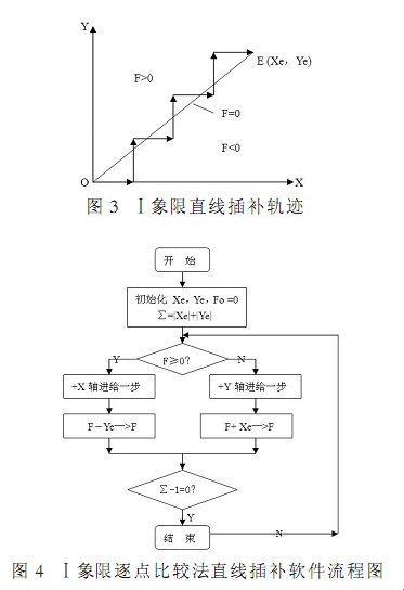 在圖 3 中 OE 為要加工的直線輪廓 而動(dòng)點(diǎn) N(Xi,Yi)對(duì)應(yīng)切削刀具的位置當(dāng)?shù)毒咛幱谥本€下方區(qū)域時(shí)(F<0) 當(dāng)?shù)毒咛幱谥本€上方區(qū)域時(shí)(F>0) 為了更靠攏直線輪廓 則要求刀具向(+X)方向進(jìn)給一步 當(dāng)?shù)毒哒锰幱谥本€上時(shí)(F=0)根據(jù)上述原則從 O(0 0)開始 走一步 算一算 判別 F 符號(hào) 再趨向直線進(jìn)給 步步前進(jìn) 直至終點(diǎn) E 這樣 通過(guò)逐點(diǎn)比較的方法 控制刀具走出一條盡量接近零件輪廓直線的軌跡 如圖 3 中折線所示 當(dāng)每次進(jìn)給的臺(tái)階(即脈沖當(dāng)量)很小時(shí) 就可將這條折線近似當(dāng)作直線來(lái)看待 顯然 逼近程度的大小與脈沖當(dāng)量的大小直接相關(guān)為了簡(jiǎn)化運(yùn)算 通常采用遞推法 即每進(jìn)給一步后新加工點(diǎn)的加工偏差值通過(guò)前一點(diǎn)的偏差遞推算出