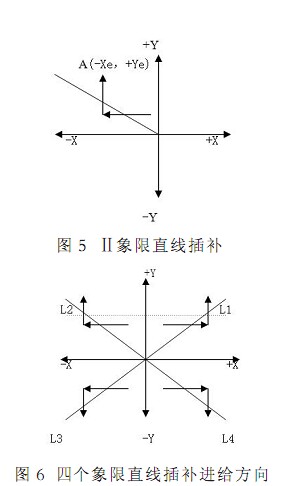 如果直接利用圖 7 來(lái)插補(bǔ)四個(gè)坐標(biāo)軸直線時(shí) 將會(huì)造成較大的插補(bǔ)誤差 顯然不太理想 為此 可對(duì)這四種特殊情況進(jìn)行專門處理 即當(dāng)判出是插補(bǔ)四個(gè)坐標(biāo)軸直線時(shí) 可將(+X)軸直線插補(bǔ)歸入(+△X)進(jìn)給方向類 將(-X)軸直線插補(bǔ)歸入(-△X)進(jìn)給方向類 將(+Y)軸直線插補(bǔ)歸入(+△ Y)進(jìn)給方向類 將(-Y)軸直線插補(bǔ)歸入(-△Y)進(jìn)給方向類 這樣可將其插補(bǔ)誤差減小到零