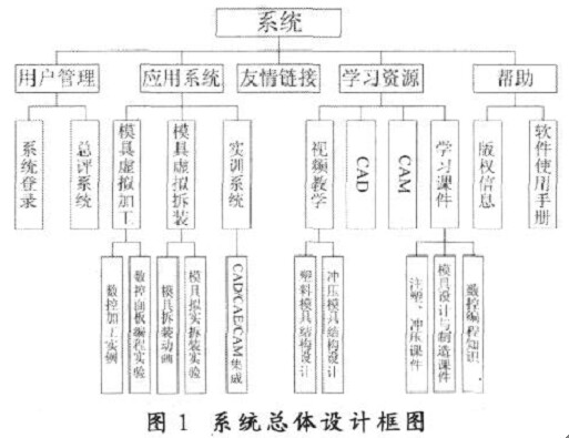 虛擬仿真實驗系統將虛擬實驗技術和模具擬實拆裝引入模具設計與制造模塊中,添加有關模具加工、模具裝配,模具結構設計和CAD、CAM等視頻資料,建立數字化模具設計與制造綜合實驗平臺。通過計算機虛擬實驗,可以有效地減少設備投資和實驗時間、強化學生的學習效果[4]。系統總體設計模塊分類如圖1所示,其中反映了本系統包含的模塊和要設計的主體內容。