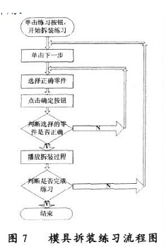 當單擊按鈕“安裝演示”,在顯示區播放模具的安裝步驟和安裝過程。單擊按鈕“拆卸演示”,在顯示區播放模具的拆卸步驟和拆卸過程。通過觀看演示,懂得實例模具的拆裝步驟,為進一步練習奠定基礎。看完模具安裝演示后,接下來是模具的安裝練習。通過觀看安裝演示后,知道安裝步驟和安裝的具體過程,這樣學生就有感性的認識。單擊“安裝練習”按鈕后,激活練習區中的各按鈕,開始模具的安裝練習。單擊“下一步”按鈕,步驟區顯示模具安裝步驟,提示區顯示練習的提示(提示選擇多少個零件),在零件區里根據步驟選擇正確的零件,單擊“確定”按鈕,系統自動判斷選擇的零件是否正確,正確的在顯示區播放安裝過程,錯誤的重新選擇。其練習流程圖如圖7所示。