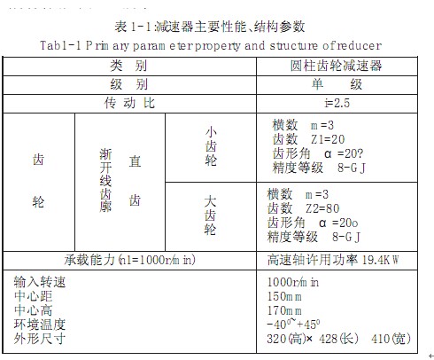 本項(xiàng)目以一級(jí)圓柱齒輪減速器作為研究對(duì)象,根據(jù)文獻(xiàn)[1]通過運(yùn)動(dòng)分析 力學(xué)分析等,計(jì)算得出的結(jié)構(gòu)性能參數(shù)列入表 1- 1,其結(jié)構(gòu)簡(jiǎn)圖如圖1- 1所示