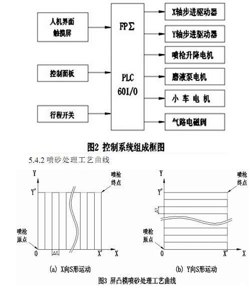 執(zhí)行自動控制程序時 工件放在小車上后 按 運行 按鈕 小車啟動和工件一起運行到工作艙內(nèi)停在加工位置 同時艙門關(guān)閉 此時磨液泵啟動 氣路電磁閥打開 噴槍按照觸摸屏上設(shè)定的工藝曲線在步進電機的驅(qū)動下進行噴砂處理 當(dāng)噴槍走完工藝曲線回到原點時 磨液泵停止工作 壓縮空氣關(guān)閉 小車啟動將工件運出工作艙 完成工件加工