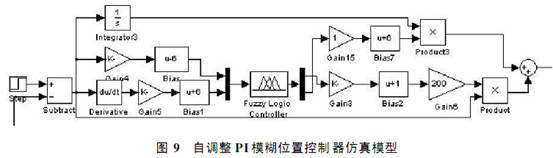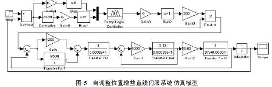 Simulink 環(huán)境中,建立了以直線電機為伺服執(zhí)行元件的自適應模糊位置控制系統(tǒng)的仿真模型( 圖5) .