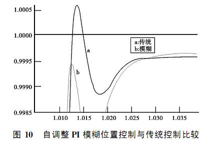 從仿真結(jié)果可以看出, 位置控制采用自調(diào)整$ kp 和$k i 的模糊控制器后,階躍響應速度快, 超調(diào)小,可以適應較大的負載,并且穩(wěn)態(tài)誤差小.