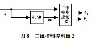 為了減小穩(wěn)態(tài)誤差,考慮位置控制器加入積分環(huán)節(jié).但如果簡單地加入一個普通積分環(huán)節(jié),通過仿真發(fā)現(xiàn),在減小穩(wěn)態(tài)誤差的同時,系統(tǒng)比原來的模糊控制容易出現(xiàn)超調(diào).基于以上考慮,設想積分系數(shù)也用模糊控制器來調(diào)節(jié), 以便達到期望的效果.則模糊控制器結(jié)構(gòu)變?yōu)閳D 8所示.