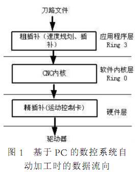 數(shù)控機(jī)床最重要的工作是自動(dòng)加工 在開放式數(shù)控系統(tǒng)中 執(zhí)行自動(dòng)加工功能時(shí) 數(shù)據(jù)處理的流程一般如圖 1一個(gè)編制好的加工文件 首先經(jīng)過 PC 用戶態(tài)程序的處理 完成所謂粗插補(bǔ)的工作 然后控制系統(tǒng)再把粗插補(bǔ)的結(jié)果通過 CNC 內(nèi)核 俗稱驅(qū)動(dòng) 傳遞給運(yùn)動(dòng)控制卡 讓控制卡完成精插補(bǔ)的工作 實(shí)際中 在 CNC 內(nèi)核層會(huì)完成更多的 實(shí)時(shí)性相對高的工作 比如端口掃描 為了討論方便 忽略這些內(nèi)容