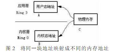 圖 2 中 物理內(nèi)存 C 被分別映射成用戶地址空間的 A 和內(nèi)核地址空間的 B內(nèi)核模式程序從 B 處開始讀取數(shù)據(jù) 用戶程序從 A 處開始寫入數(shù)據(jù)