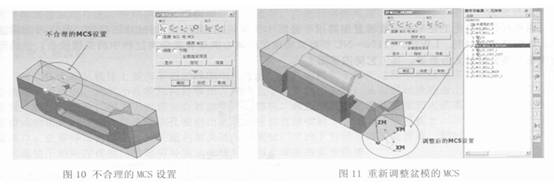 根據(jù)仿真過(guò)程的監(jiān)測(cè), 及時(shí)發(fā)現(xiàn)了裝夾的不和性, 并在方案1 的指導(dǎo)下, 重新調(diào)整MCS 坐標(biāo)系, 如圖11 所示, 并對(duì)調(diào)整后的刀具軌跡進(jìn)行計(jì)算和輸出. 由此帶來(lái)的附加問(wèn)題是過(guò)長(zhǎng)的輸出程序時(shí)間.