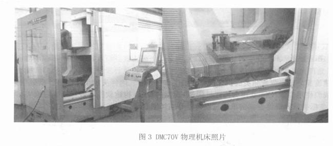 DMC70V 德瑪吉物理機床屬于三軸立式高速加工中心, 其主軸為X / Y/ Z, 機床的行程為 700 mm @500 mm @ 650 mm, 控制系統為Heidehan iTNC530, 配備的刀柄主要為H SK 高速銑刀柄. 物理機床的影像資料如圖3所示[ 2]