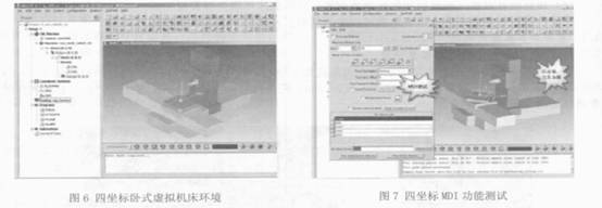 通過以上工作, 最終構建完成的四坐標臥式虛擬機床環境如圖6 所示. 工藝編程人員可以直接應用該虛擬機床對加工程序進行仿真、校驗. 為了保證機床環境的正確性, 通過MDI 方式對機床進行測試, 其測試結果如圖7 所示.