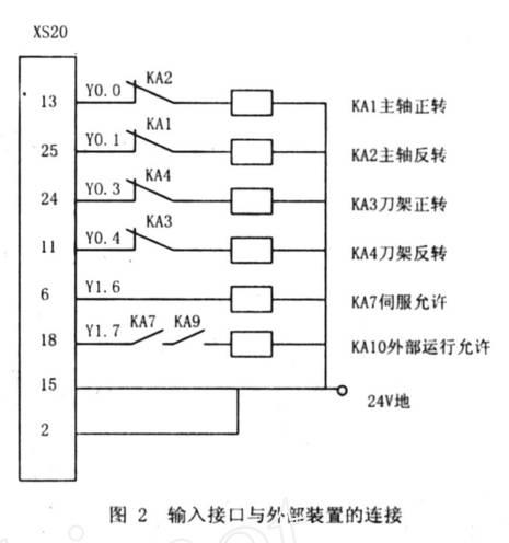 數(shù)控車床的主傳動需求較寬的調(diào)速規(guī)模和滿意的輸出力矩.依據(jù)機(jī)床需求保存原車床主軸變速箱 , 內(nèi)嵌 PLC經(jīng)過輸出開關(guān)量接口 XS20中的 Y010 和 Y011 , 別離操控主軸電機(jī)的正、回轉(zhuǎn)中心繼電器 KA1和 KA2 (KA1和 KA2連有硬件互鎖) , 電氣銜接圖見圖2 (見88頁) . 選用機(jī)械換檔辦法完結(jié)主軸有級調(diào)速 , 為使改造后的車床具有主動加工螺紋功用 , 在主軸電動機(jī)結(jié)尾設(shè)備 1024 線的增量式光電編碼器 , 使其轉(zhuǎn)速與主軸轉(zhuǎn)速共同 , 即主軸轉(zhuǎn)1周 , 光電編碼器隨之轉(zhuǎn)1周. 光電編碼器發(fā)生的速度、方向信號以脈沖辦法由 XS9主軸操控接口發(fā)給數(shù)控體系 , 數(shù)控體系依據(jù)主軸的脈沖信號操控步進(jìn)驅(qū)動設(shè)備宣布斷定的脈沖信號 , 使刀架經(jīng)過絲杠的轉(zhuǎn)向發(fā)生進(jìn)給運(yùn)動 , 操控進(jìn)給軸與主軸同步 , 然后加工出所需的螺紋.