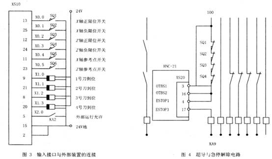 超程與急停免除是數(shù)控機(jī)床進(jìn)行數(shù)控加工呈現(xiàn)意外毛病時所采納的保護(hù)措施. 這次改造中對上述毛病的掃除辦法規(guī)劃為: 數(shù)控機(jī)床立即中止運(yùn)動或切除動力設(shè)備電源 ,并向數(shù)控體系供給毛病信號 , 經(jīng)數(shù)控設(shè)備處置顯現(xiàn)報警信號. 圖 4 為超程與急停免除硬件電路銜接圖 , 圖中串聯(lián)聯(lián)接的 SQ1 (SQ3)和 SQ2(SQ4)