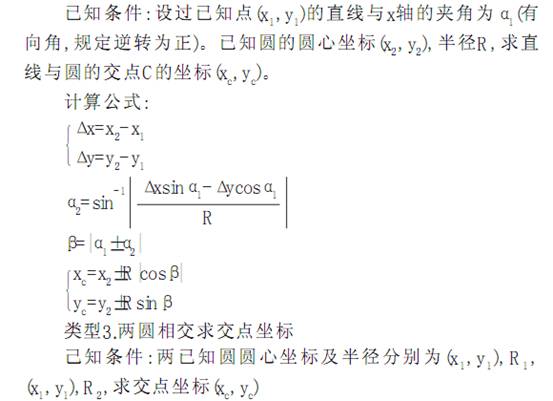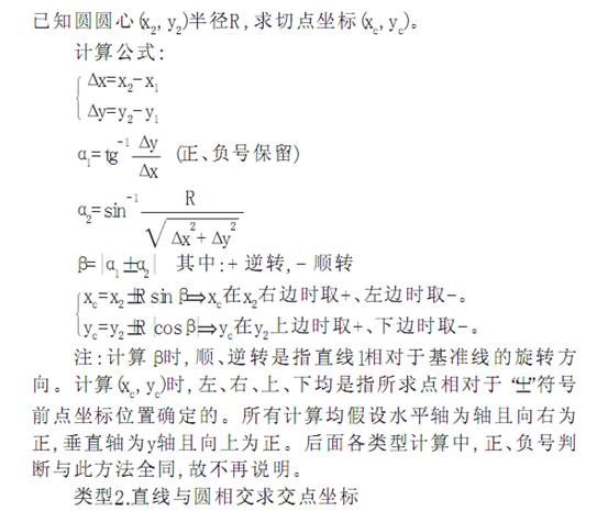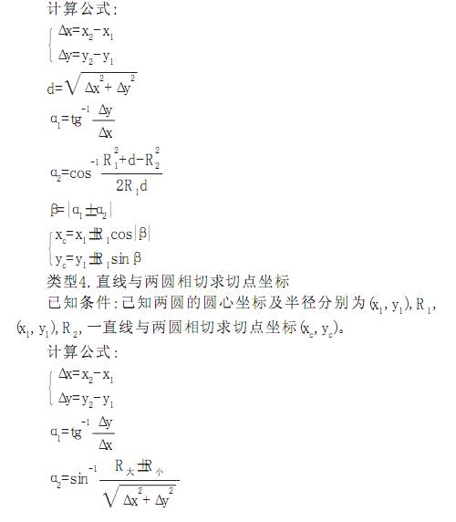 以上四種類型對任何象限任何方位的基點計算, 只要根據(jù)以上條件確定出(x1, y1)、 (x1, y1)及R1、 R2等, 就可套用上述相應(yīng)公式求解。需要注意的是計算或確定α 1時, 若為負值, 不可丟掉負號, 計算β 時, α 2為有向角, 是自基準線向規(guī)定的直線旋轉(zhuǎn), 逆轉(zhuǎn)為正, 轉(zhuǎn)角指不大于90° 的那個角。計算(xc, yc)時也應(yīng)弄清是相對于哪一點計算。