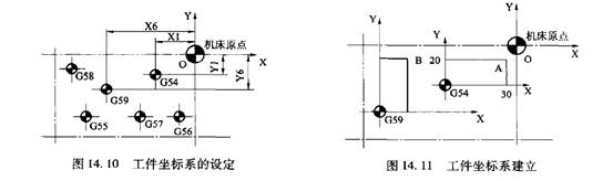 例如,用G54和G59建立兩個(gè)坐標(biāo)系,首先測(cè)量出對(duì)應(yīng)工件原點(diǎn)與機(jī)床原點(diǎn)的偏置量,即G54 (X1, Y1, Z1)、G59 (X6, Y6, Z6),然后在相應(yīng)的工件坐標(biāo)系選擇畫(huà)面上填人相應(yīng)值,就完成了G54 , G59工件坐標(biāo)系的設(shè)定。此后程序中有G90 G54 X30 Y20時(shí),則向預(yù)先設(shè)定的工件坐標(biāo)系中的A點(diǎn)移動(dòng),如圖14. 11所示。