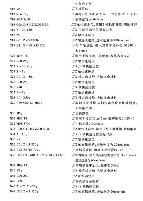 用木錘或銅棒敲擊工件,使平行墊塊不能移動后夾緊工件。利用尋邊器找正工件X, Y軸零點,使之位于工件對稱中心位置。設置Z軸零點與機械原點重合。刀具長度補償利用Z軸定位器設定(有時也可不使用刀具長度補償功能,而根據不同刀具設定多個工件坐標系零點進行編程加工)。工件上表面為執行刀具長度補償后的Z零點表面。