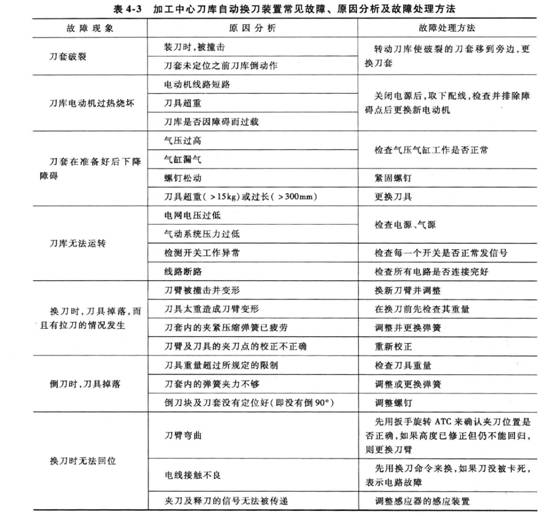 加工中心刀庫自動換刀裝置常見故障、原因分析及故障處理方法,見表4-30