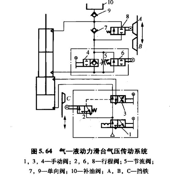 氣一液動力滑臺是采用氣一液阻尼缸作為執行元件,在機械設備中用來實現工作滑臺的進給運動,圖5. 64為氣液動力滑臺氣壓傳動系統的原理圖。該氣一液動力滑臺能完成兩種工作循環。