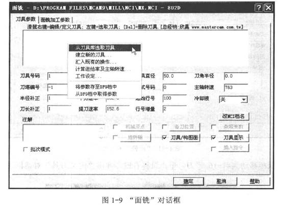 1) 在主菜單區(qū)單擊“回主功能表”,返回到主界面,單擊“刀具路徑”“面銑”“串聯(lián)”,選擇剛才繪出的矩形(高亮顯示),單擊“執(zhí)行”,彈出“面銑”對(duì)話框,將鼠標(biāo)移動(dòng)到中間空自處,單擊鼠標(biāo)右鍵選擇“從刀具庫(kù)選取刀具…”,如圖1-9所示。