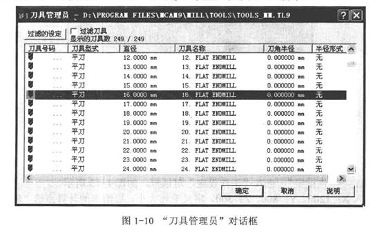 2)系統(tǒng)彈出圖1-10所示的“刀具管理員”對(duì)話框,不勾選“過(guò)濾刀具”,選擇“平刀”、“直徑16.0000 mm ".單擊“確定”。