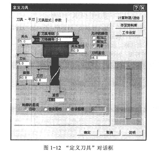 4)將鼠標(biāo)移動(dòng)到##1-16平刀,單擊鼠標(biāo)右鍵,彈出“定義刀具”對(duì)話框,如圖1-12所示。