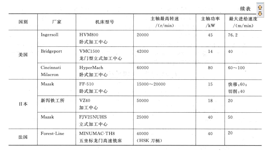 日本日立精機的HG400皿型加工中心主軸最高轉速達36000一40000r/min,作業臺疾速移動速度為%一40m/min。選用直線電機的美國Ingersoll公司的HVM800型高速加工中心進給移動速度為60m/min。美國洛克希德飛機公司在高速銑削鋁合金時,當主軸轉速從4000r/min進步到20000r/min,資料切除率添加3倍。單位功率的資料切除率可到達130一160cm’/(min.kW),是一般銑削的4—5倍。